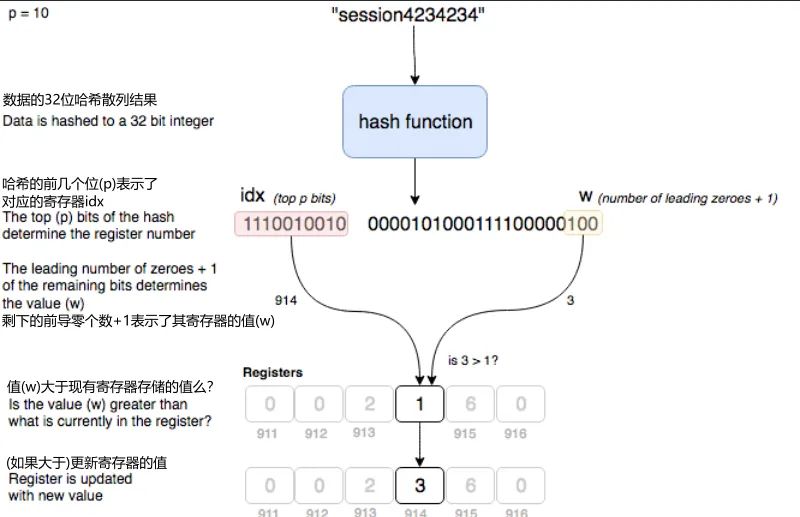 用下面的小工具查看在 HyperLogLog 中添加一项数据时会发生什么